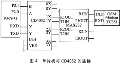 CD4052實(shí)際上是2個(gè)一分四的數(shù)據(jù)分配器,所擴(kuò)展的串口均是全雙工異步工作模式,具有很高的工作速度,方便地實(shí)現(xiàn)了一片單片機(jī)多個(gè)串口的擴(kuò)展能力。以Siemens公司的TC35i