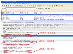 以上是一個用戶開機的信令過程,在BSSMAP消息層中,可以獲取CGI=0X0457-2222;在DTAP消息層中,可以獲得獲得本次消息類型為LocationUpdatingREQ,同時用戶標識為TMSI=0X8c000093,通過對對之前或之后(簽權、IDREQ/RSP)等信令的關聯,可以獲得用戶IMSI、MSISDN和CGI的對應關系。其它信令過程,如周期性位置更新、短信收發(fā)、主被叫等,和以上分析過程類似。