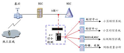 A口信令檢測的應用非常廣泛,如網絡質量分析系統(tǒng)、小區(qū)短信、小區(qū)彩信、垃圾短信攔截等。這些正成為通信運營商的業(yè)務增長點。其業(yè)務應用組網圖如下:
