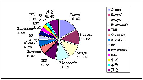 賽迪顧問(wèn)預(yù)測(cè),2009年中國(guó)統(tǒng)一通信市場(chǎng)中,在通信設(shè)備領(lǐng)域,Cisco市場(chǎng)份額將達(dá)到16.8%,繼續(xù)保持領(lǐng)頭樣的位置,而且市場(chǎng)份額有望繼續(xù)增加,Nortel和Avaya緊隨其后,市場(chǎng)份額分別將達(dá)到12.6%和11.7%。而在軟件廠商方面,Microsoft和IBM將繼續(xù)保持市場(chǎng)領(lǐng)先地位,市場(chǎng)份額分別將達(dá)到11.6%和9.7%,增長(zhǎng)勢(shì)頭強(qiáng)勁。其它市場(chǎng)份額較大的國(guó)外統(tǒng)一通信廠商還有西門子、阿爾卡特、愛(ài)立信、HP等。在國(guó)內(nèi)方面,中興和H3C分別以約3%的市場(chǎng)份額占據(jù)領(lǐng)先位置。