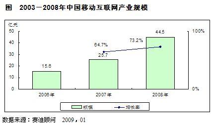 2008年中國移動互聯(lián)網(wǎng)產(chǎn)業(yè)以73.2%的高速增長,實現(xiàn)了44.5億元的收入規(guī)模。