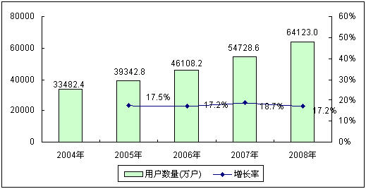 中國移動通信產(chǎn)業(yè)發(fā)展可以追溯到1987年,當時中國確定了以TACS制式作為模擬制式蜂窩移動電話的標準,首次為中國移動通信技術產(chǎn)業(yè)化發(fā)展奠定了基礎。隨著通信技術的進步,數(shù)字化的GSM移動通信網(wǎng)絡制式快速取代了原有的TACS制式。進入2000年以后,伴隨中國改革開放的深入和經(jīng)濟的進一步轉型,移動通信技術得到迅猛發(fā)展,手機普及率得到迅速提高。2004~2008年,中國移動電話用戶數(shù)量每年都保持著17%以上的快速增長,截止到2008年底,中國移動電話用戶數(shù)量已經(jīng)達到6.41億戶,與2004年相比增長了近一倍。
