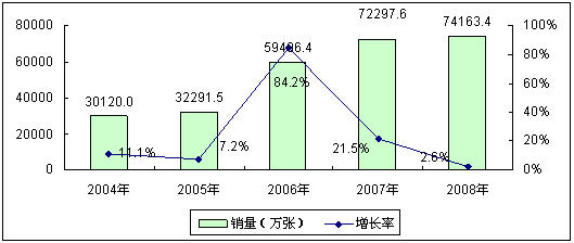在中國移動用戶快速增長的直接帶動下,中國移動通信卡市場規(guī)模也迅速擴大,此外,基于用戶網(wǎng)間、網(wǎng)內(nèi)換號以及SP業(yè)務的蓬勃發(fā)展也為中國移動通信卡市場的快速增長注入動力。2004年到2008年,中國移動通信卡市場銷量規(guī)模從3.0億張急劇增長到7.4億張,四年年均復合增長率達到25.3%,移動通信也成為中國智能卡應用的最大市場。