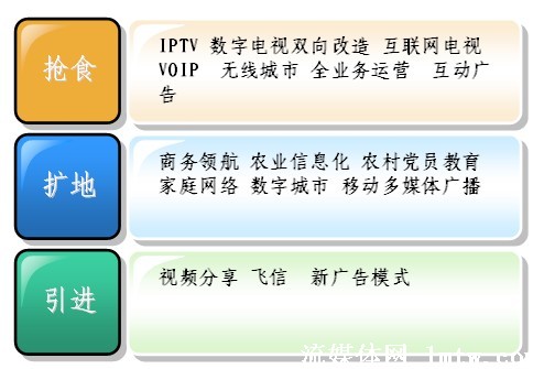 從廣義上講,廣電、電信、互聯網都屬于信息行業(yè),現在都面臨著自己在增長中遇到的問題,也就是滯漲。滯漲逼迫大家必須去轉型,轉型現在有三種方式,一個是搶,一個是擴,一個是引進。從最近會議上來看,目前大家對搶食比較感興趣,畢竟有現成的一碗紅燒肉已經做好了,對后面兩個,相對來說談得還比較少,因為后面兩個,需要引入一些創(chuàng)新的技術,引入創(chuàng)新的思維。