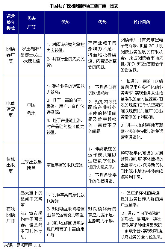 International)分析認為,目前中國電子書市場以閱讀器廠商及電信運營商兩種力量為主導(dǎo),此外還包括傳統(tǒng)出版商、在線閱讀廠商等其他力量。對現(xiàn)有各種運營模式的企業(yè)分析如下: