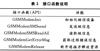 短信貓通過RS 232串口與計(jì)算機(jī)連接,系統(tǒng)需通過接口驅(qū)動(dòng)短信貓發(fā)送或讀取短信,各接口函數(shù)說明見表2。