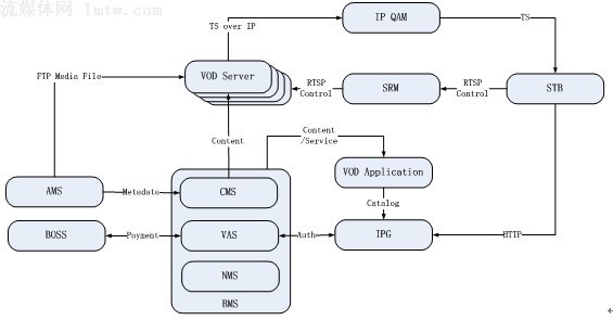 QAM則是網絡設備產品,因此交互平臺架構的核心組成包括:視頻服務系統(tǒng)VOD Server、業(yè)務管理系統(tǒng)BMS、會話和資源管理系統(tǒng)SRM、應用管理系統(tǒng)VOD