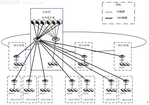 方案二:全集中式。在總前端集中部署若干臺視頻服務器,通過萬兆網絡直接向各分前端提供視頻流服務;示意圖如下: