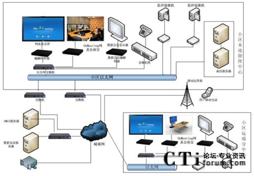 Communication Server)服務(wù)器,實現(xiàn)OnMeeting網(wǎng)真預(yù)約會議、數(shù)據(jù)協(xié)同以及即時通信功能,使得網(wǎng)真視頻會議與社區(qū)管理中原有辦公和監(jiān)控系統(tǒng)有機的融合,提供了高清晰、高效率、1:1真人大小圖像的視頻通信,使得社區(qū)安防會商實現(xiàn)了更有效的溝通。