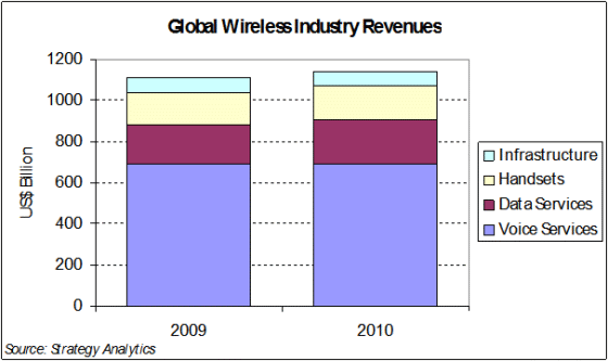 2009年,無(wú)線數(shù)據(jù)業(yè)務(wù)收入比上年增長(zhǎng)了9.5%,支撐了行業(yè)總收入沒有下滑。Strategy Analytics預(yù)測(cè)2010年無(wú)線數(shù)據(jù)業(yè)務(wù)收入將增長(zhǎng)13%,市場(chǎng)整體規(guī)模將超過2000億美元。