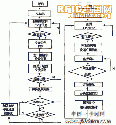 對(duì)于底層軟件,主要是門(mén)口終端的控制軟件,其工作流程如圖5所示。門(mén)口終端上電后,先進(jìn)行初始化工作,然后開(kāi)始掃描按鍵和一卡通信息,當(dāng)確認(rèn)有變化時(shí),微處理器CPU l先給分層器發(fā)送一幀信息,并且監(jiān)聽(tīng)分層器的反饋信息,同時(shí)啟動(dòng)DSP通過(guò)網(wǎng)絡(luò)端口發(fā)送廣播消息給監(jiān)控終端,以便啟動(dòng)監(jiān)控終端的接受線程接受視頻流和訪問(wèn)信息或一卡通信息。當(dāng)時(shí)間超過(guò)l min或終止鍵按下時(shí),雙方終止通信,門(mén)口終端與監(jiān)控終端之間由CPU1觸發(fā)DSP中斷,使其停止發(fā)送視頻流數(shù)據(jù)。