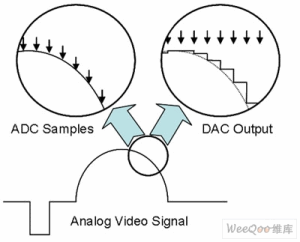 由攝像機(jī)或其他設(shè)備捕獲的模擬視頻信號(hào)通過(guò)模/數(shù)轉(zhuǎn)換器(ADC)進(jìn)行數(shù)字化處理,它在每個(gè)時(shí)鐘邊沿即時(shí)記錄數(shù)據(jù)(圖2)。模擬信號(hào)連續(xù)變化,而轉(zhuǎn)換成數(shù)字信號(hào)時(shí)則是定時(shí)采樣。經(jīng)過(guò)數(shù)字處理和傳輸后,數(shù)字信號(hào)通過(guò)數(shù)/模轉(zhuǎn)換器(DAC)轉(zhuǎn)變成模擬信號(hào)。DAC的輸出如圖2的右上角所示,箭頭代表時(shí)鐘信號(hào)。
