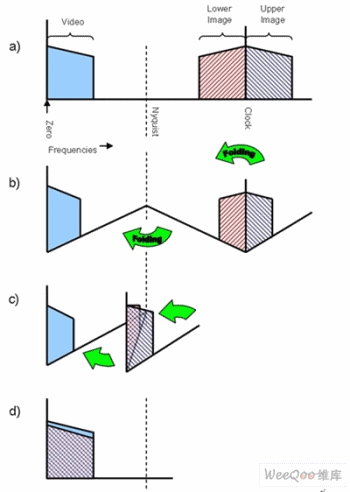 從圖5可以看出重建濾波器的作用,利用參考書(shū)中提供的定理可以很容易理解頻譜混疊。通常,在頻域,頻率和放大倍數(shù)都采用對(duì)數(shù)刻度,重建濾波器的頻響特性表現(xiàn)為平滑曲線。然而,為了說(shuō)明邊帶重疊的位置,我們用線性坐標(biāo)表示頻率和放大倍數(shù)。為了表示低通濾波器在同樣刻度坐標(biāo)下的衰減特性,從濾波器頻響曲線可以看出:對(duì)于有用的視頻信號(hào)衰減很少,對(duì)于鏡像頻率衰減較大。圖5b和5c顯示了混疊效應(yīng),但是應(yīng)該注意到,與圖3d相比,圖5d中的鏡像頻率被顯著衰減。