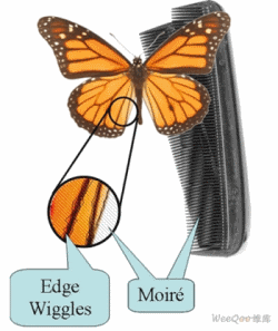 為了反映鏡像邊帶沒(méi)有衰減的效果,圖3b和3c示意了奈奎斯特頻率和時(shí)鐘頻率處的頻譜重疊。這些疊加的鏡像邊帶信號(hào)(圖3d)與視頻信號(hào)相比具有隨機(jī)的相位差。圖4表示我們需要避免的圖像誤差!斑吘墧[動(dòng)”是高頻邊緣干擾,它重疊在視頻信號(hào)上,具有隨機(jī)變化的相位。摩爾效應(yīng)是時(shí)鐘、視頻信號(hào)頻率之間相互作用的結(jié)果。