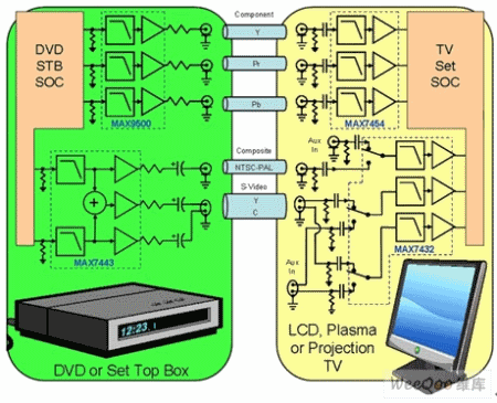 圖6左側(cè)是機(jī)頂盒或DVD機(jī)的框圖,片上系統(tǒng)(SOC)包含了DAC,輸出經(jīng)過(guò)低通濾波器(例如MAX7443)進(jìn)行視頻重建。濾波器芯片還包含75Ω同軸電纜驅(qū)動(dòng)器,驅(qū)動(dòng)信號(hào)在電纜上的傳輸。圖6右側(cè)用于信號(hào)接收,信號(hào)在經(jīng)過(guò)抗混疊濾波器后送入電視機(jī)SOC的ADC。