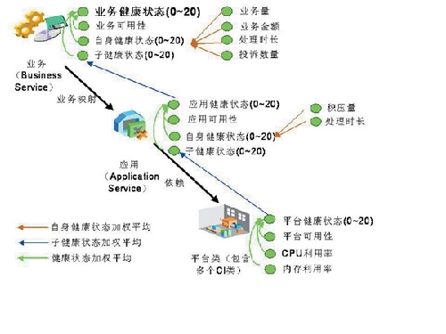 CI/KPI模型的建立,成功地將傳統(tǒng)監(jiān)控系統(tǒng)的監(jiān)控難點(diǎn)轉(zhuǎn)變?yōu)榱咙c(diǎn),通過(guò)對(duì)模型中父子業(yè)務(wù)間關(guān)系、業(yè)務(wù)與后臺(tái)資源間關(guān)系的結(jié)構(gòu)化梳理,多維度數(shù)據(jù)的采集計(jì)算,有效量化了業(yè)務(wù)健康度指標(biāo)。同時(shí),模型中所綜合的業(yè)務(wù)可用性、業(yè)務(wù)辦理量、后臺(tái)資源使用情況等全方位信息,尤為適合公司管理人員了解業(yè)務(wù)通體運(yùn)營(yíng)情況。