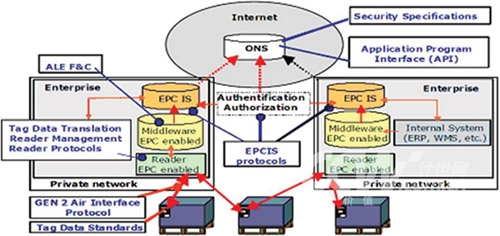 EPCglobal提出了Auto-ID系統(tǒng)的五大技術(shù)組成,分別是EPC(電子產(chǎn)品碼)標簽、RFID標簽閱讀器、ALE中間件實現(xiàn)信息的過濾和采集、EPCIS信息服務(wù)系統(tǒng),以及信息發(fā)現(xiàn)服務(wù)(包括ONS和PML)。由于從一開始就讓世界各大洲的從業(yè)人員充分參與,EPCGlobal標準(架構(gòu)圖如下)得到了較廣泛認同,這里不再對其標準體系架構(gòu)贅述。