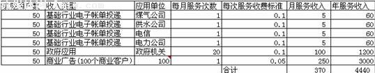 那么如果一家運(yùn)營(yíng)商已經(jīng)設(shè)計(jì)出了符合市場(chǎng)需求的業(yè)務(wù)模式,未來(lái)的盈利前景將會(huì)怎樣呢?不妨讓我們模擬分析一下。假設(shè)一個(gè)運(yùn)營(yíng)商擁有50萬(wàn)左右的城市家庭用戶。在基礎(chǔ)行業(yè)領(lǐng)域,每月可以幫助煤氣、供水、電信和電力公司各發(fā)送1次賬單;在商業(yè)客戶方面,擁有百家左右的合作伙伴,每月每家合作伙伴發(fā)送1條短信廣告;在政府機(jī)關(guān)領(lǐng)域,粗略估算政府機(jī)關(guān)每月總計(jì)使用20次左右;每個(gè)家庭用戶則每月收到電信短信約125條。假設(shè)運(yùn)營(yíng)商的服務(wù)資費(fèi)中,除了商業(yè)廣告為0.05元/條外,均為0.1元/條。那么,盈利情況又該怎樣呢?