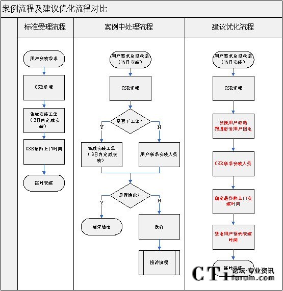 結(jié)束通話,我不禁深思:單從流程上講,這是一個標(biāo)準(zhǔn)的操作流程,由CSR下工單,工單流轉(zhuǎn)到安裝人員處,安裝人員上門安裝。同時該流程也有明確的KPI指標(biāo)(3天內(nèi)完成)。從這一點(diǎn)來看,似乎這流程沒有什么問題,CSR的服務(wù)也完全符合標(biāo)準(zhǔn)。但試問,這個流程的執(zhí)行能夠令用戶滿意嗎?不會!因?yàn)椋河脩舻母惺苁菣z驗(yàn)流程的唯一標(biāo)準(zhǔn)。