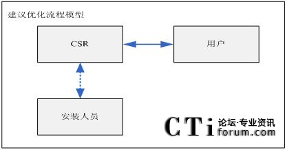 對于客服中心來講,當(dāng)受理了用戶的需求時,CSR與用戶便成了服務(wù)流程中的關(guān)鍵角色,安裝人員只是CSR的一個協(xié)作角色(內(nèi)部流程下游角色)。如果在為用戶提供服務(wù)過程中,將安裝人員“引入”流程中,無疑將影響流程的執(zhí)行效果。另外,讓用戶代替CSR去聯(lián)系“安裝人員”這更加影響用戶的感受。