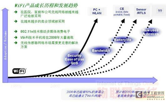 將Wi-Fi用于WSN網(wǎng)絡,確實是個不錯的主意。因為它能夠享受到正在被大規(guī)模部署的Wi-Fi網(wǎng)絡所帶來的成熟的技術(shù)、各種層出不窮的Wi-Fi設備、既有的網(wǎng)絡設施、架構(gòu)支持、豐富的網(wǎng)絡知識,另外還有快速安裝和減少了學習周期和與其他協(xié)議互操作而帶來的各種麻煩,加快開發(fā)周期。