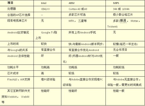 這三種處理器架構(gòu)各有優(yōu)缺點(diǎn),都希望成為未來Android互聯(lián)網(wǎng)電視(如果成功的話)的最主流平臺(tái)。那么哪一個(gè)處理器將最終勝出呢,答案只有留給時(shí)間來揭曉,我們不妨先來對(duì)這三個(gè)架構(gòu)進(jìn)行一番比較:
