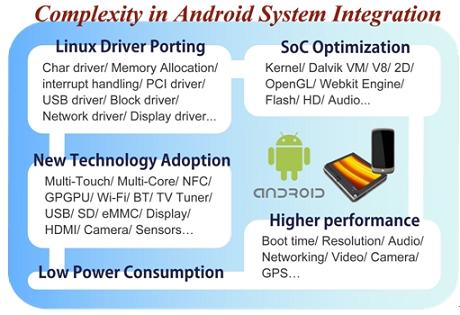對廠商而言,開發(fā)一款A(yù)ndroid設(shè)備,不僅僅只是將所有零組件組合成為一個產(chǎn)品那么容易,最大的學(xué)問便在于將系統(tǒng)單芯片(System-on-a-chip,SoC)、各種新技術(shù)和Android系統(tǒng)進(jìn)行整合,SoC涉及像是Dalvik Virtual Machine、OpenGL、V8、Webkit Engine等上層的演算,與Android間的結(jié)合便必須透過不斷的嘗試與驗(yàn)證,才能研發(fā)出既符合成本效益、又有良好效能的優(yōu)化產(chǎn)品。目前市面上有些SoC廠商已針對Android系統(tǒng)的特性,提供整合過的SoC平臺,將藍(lán)牙、相機(jī)或上網(wǎng)等常用功能模組預(yù)先寫入,減少終端成品廠商費(fèi)力整合開發(fā)的時間,但對廠商而言,這樣的預(yù)先整合是否適合自身產(chǎn)品,以及是否需要再作更細(xì)致的修改,則又是更困難的課題。