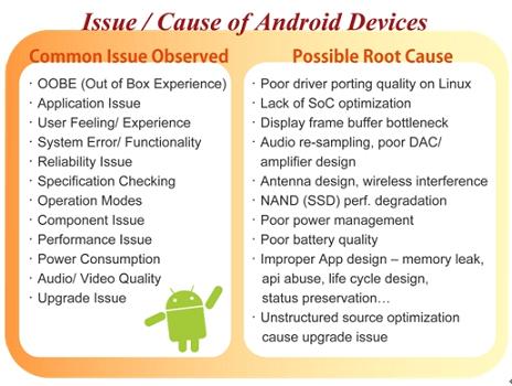 盡管Android系統(tǒng)的普及看似指日可待,但在實(shí)際的產(chǎn)品應(yīng)用上,也有其可能產(chǎn)生的問題風(fēng)險。Android作為一個開放式的操作系統(tǒng),是Google提供廠商的操作系統(tǒng)參考架構(gòu)(reference design),廠商能有充足的發(fā)揮空間,以Android為基礎(chǔ)向上開發(fā)設(shè)計(jì)自家產(chǎn)品,但也因?yàn)檫@樣的開放性與自由性,讓廠商在軟硬件結(jié)合的這個環(huán)節(jié)必須下更大的功夫,像是如何挑選合適的硬件包括基頻處理器、通信芯片、觸控感應(yīng)芯片、天線與存儲器模組等,以及如何調(diào)整出最適當(dāng)?shù)能浖O(shè)定等,更重要的是如何將軟硬件整合,開發(fā)出差異化的產(chǎn)品。這中間所有的細(xì)節(jié)都會對產(chǎn)品最終樣貌產(chǎn)生莫大的影響,像是其功能的完整度、使用接口的設(shè)計(jì)、效能表現(xiàn)(例如觸控滑動畫面、開啟程序所需時間)、品質(zhì)可靠度、甚至是后續(xù)的固件升級動作等等。在此百佳泰便試圖以專業(yè)中立的測試實(shí)驗(yàn)室角度,來點(diǎn)出廠商應(yīng)用Android于手機(jī)、平板電腦或其他設(shè)備時應(yīng)注意的開發(fā)重點(diǎn),以希冀作為一個有效的參考資訊。
