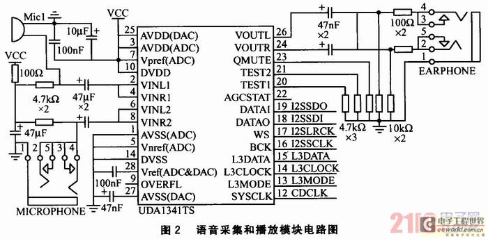 語(yǔ)音采集和播放模塊的作用是將音頻模擬信號(hào)轉(zhuǎn)換為數(shù)字信號(hào),并對(duì)信號(hào)進(jìn)行PCM編碼。其電路如圖2所示。采用Philips公司的UDA1341 TS型立體聲音頻CODEC進(jìn)行音頻編解碼。該芯片提供2個(gè)麥克風(fēng)輸入,可實(shí)現(xiàn)單端輸入、差分輸入等靈活配置,并設(shè)置了可編程增益放大器和自動(dòng)增益控制器,可保證高質(zhì)量的音頻獲;同時(shí),還集成了聽筒和喇叭輸出的驅(qū)動(dòng)器,喇叭音量可以通過(guò)編程調(diào)整。S3C2440A-40微處理器與UDA1341TS編解碼器通過(guò)I2S總線直接相連,并采用DMA發(fā)送/接收方式,完成系統(tǒng)的錄音和放音。