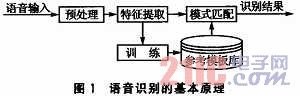 語音識別的基本原理如圖1所示。語音識別包括兩個階段:訓練和識別。不管是訓練還是識別,都必須對輸入語音預處理和特征提取。訓練階段所做的具體工作是通過用戶輸入若干次訓練語音,經(jīng)過預處理和特征提取后得到特征矢量參數(shù),最后通過特征建模達到建立訓練語音的參考模型庫的目的。而識別階段所做的主要工作是將輸入語音的特征矢量參數(shù)和參考模型庫中的參考模型進行相似性度量比較,然后把相似性最高的輸入特征矢量作為識別結果輸出。這樣,最終就達到了語音識別的目的。