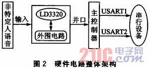如圖2所示,硬件電路主要包括主控核心部分和語音識別部分。語音進入語音識別部分后,將處理過的數(shù)據(jù)并行傳輸?shù)街骺刂破,主控制器?jīng)過處理后,發(fā)送命令數(shù)據(jù)到USART,USART可用于擴展外圍串行設備,如語音合成模塊等。