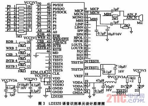 圖3為語音識別部分原理圖,參照了ICRoute發(fā)布的LD3320數(shù)據(jù)手冊進行設計。LD3320的內部集成了快速穩(wěn)定的優(yōu)化算法,不需外接Fla-sh、RAM,不需要用戶事先訓練和錄音而完成非特定人語音識別,識別準確率高。