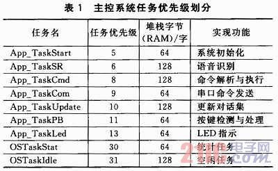 表1中除OSTaskStat和OSTaskIdle任務為系統(tǒng)自帶,其他7個任務均為用戶創(chuàng)建。App_TaskStart是系統(tǒng)的第一個任務,對系統(tǒng)時鐘和底層設備進行初始化,創(chuàng)建所有事件和其他各項用戶任務,并對系統(tǒng)狀態(tài)進行監(jiān)測;App_TaskSR完成語音識別;App_TaskCmd完成對話集中命令的解析和執(zhí)行,并通過USART1向外發(fā)送;App_TaskCom作為外圍擴展任務,通過USART2向外發(fā)送指令或數(shù)據(jù),負責控制外圍擴展設備,如語音合成設備等;