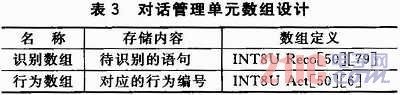 為了方便進行對話的管理,本文中設計了一個對話管理單元,用于對等待識別的語句和等待執(zhí)行的命令進行存儲,在主控制器中通過定義二維數(shù)組來實現(xiàn)。LD3320每次識別最多可以設置50項候選識別句,每個識別句可以是單字、詞組或短句,長度為不超過10個漢字或者79個字節(jié)的拼音串。基于上述原因,本文設計的對話管理數(shù)組如表3所列。