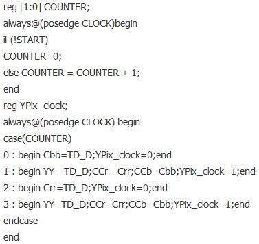 以上代碼完成了圖3的功能,輸入的信號(hào)名為T(mén)D_D,輸出的三路信號(hào)是Cbb,YY,Crr。注意到還有個(gè)YPix_clock,實(shí)際上是27M的2分頻,這個(gè)時(shí)鐘非常有用,在下面將詳細(xì)闡述。