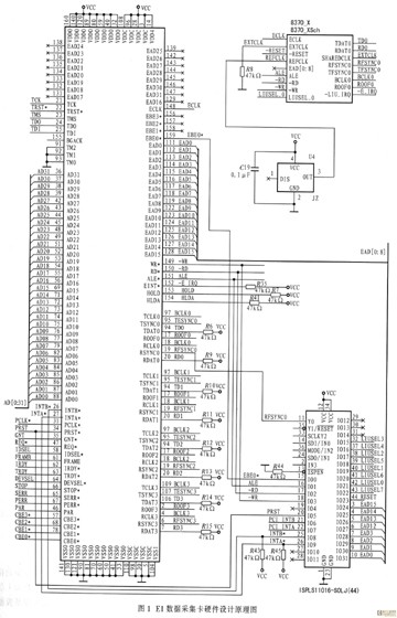 隨著電信網絡迅速發(fā)展,基于軟交換技術的NGN網絡應運而生。在構建中,NGN需通過信令網關SG與現有的七號信令網互通,但在物理上采用HDLC格式的 E1傳輸。為了維護NGN網絡,實現不同采集口的多協議關聯、呼叫的合成等功能,相應的測試儀表必須提供網卡和E1卡的測試接口。根據NGN網絡測試儀表的總體設計方案要求,數據采集卡采用PCI插槽,E1信號經物理接口器件成幀,通過串口送給MUSYCC,完成消息重組,最后通過PCI總線將消息送至上層軟件進行協議分析處理。數據采集卡提供網絡接口的物理層、鏈路層功能以及PCI規(guī)范接口,可同時監(jiān)測8路E1信號。