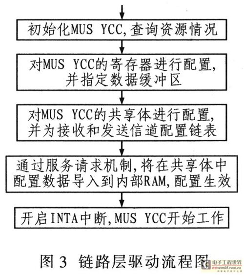 鏈路層HDLC控制器主要完成內部寄存器和映射的共享體配置。共享體用于HDLC寄存器的初配、接收和發(fā)送緩沖區(qū)以及時隙映射表的配置。HDLC控制器為每個信道都建立一個消息鏈表,這樣數據緩沖區(qū)可以循環(huán)利用。HDLC控制器與成幀器的對應關系決定于HDLC控制器端口映射方式的設置。其配置流程如圖3所示。