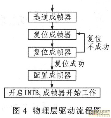 物理層通過地址總線映射配置成幀器,其中PCI橋設備和成幀器之間經過CPLD控制選通。物理層驅動完成配置成幀器、復位控制等。成幀器是將E1上的比特流整合成符合規(guī)范的HDLC幀,其中一個標準HDLC幀包括32個時隙,這些時隙可配置映射到HDLC控制器的端口信道,實現2 M、N×64 K、N×8 K高速模式。其配置流程如圖4所示。
