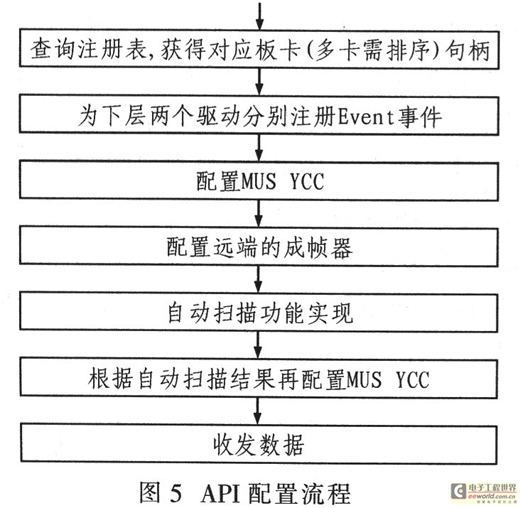 由于E1數據采集卡的MUSYCC控制器是PCI多功能設備,所以應用程序應當合理調整兩個功能驅動程序的控制順序,實現E1數據的正常采集。其E1卡應用程序(API)的配置流程如圖5所示。