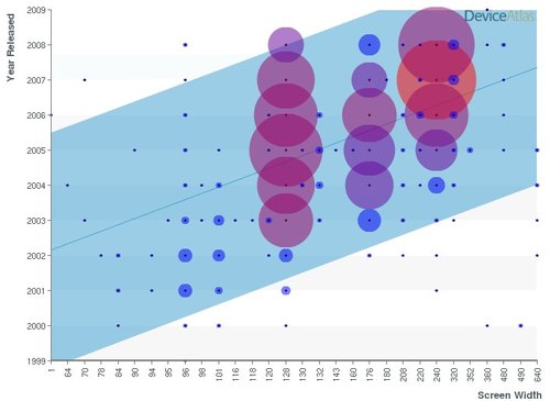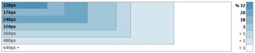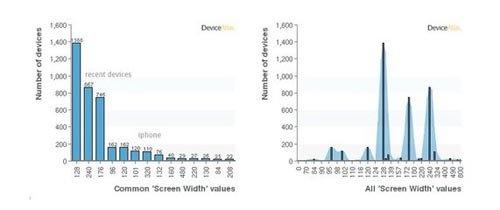 還有一點,不到5%的設備寬度大于320個像素。但這一數(shù)字可能會在未來有所提升,目前已經(jīng)可以看到,小屏幕(128,176等)設備正逐漸被大屏幕(240+)設備所代替。下面的圖表給出了相關的分析。