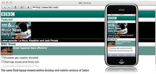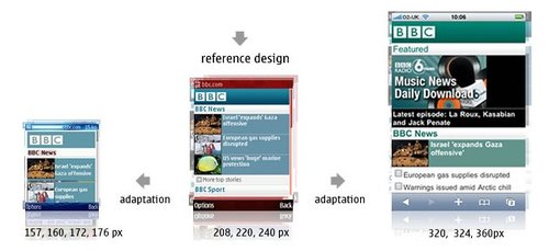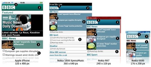 BBC還可以為特定的設備(或是一組設備)重新編排一些內(nèi)容。iPhone有非常豐富的功能,因此iPhone版的BBC還有音樂下載選項,而其他的設備可能只會顯示今天最熱門的‘BBC新聞’?梢愿鶕(jù)數(shù)據(jù)的大小,多媒體的處理能力甚至是屏幕的尺寸決定是否需要針對iPhone提供更加豐富的內(nèi)容。以Nokia 6680上的‘特色’顯示為例,它大部分的顯示內(nèi)容是讓用戶滾動屏幕查看今天最熱門新聞故事。iPhone上顯示了三個新聞故事,而其中只有一篇配有插入。這使得用戶無需滾動屏幕就可以大致了解全部的咨詢。