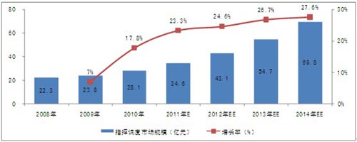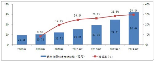 根據(jù)對下游行業(yè)的調(diào)研和關聯(lián)市場的分析,2010年,中國指揮調(diào)度市場規(guī)模已達到28.1億元。隨著下游行業(yè)投資規(guī)模的擴大、產(chǎn)品的升級換代及技術(shù)的發(fā)展,行業(yè)市場規(guī)模將保持較快的增長速度,未來4年的復合增長率為26.31%,2014年,市場規(guī)模將達到69.8億元。