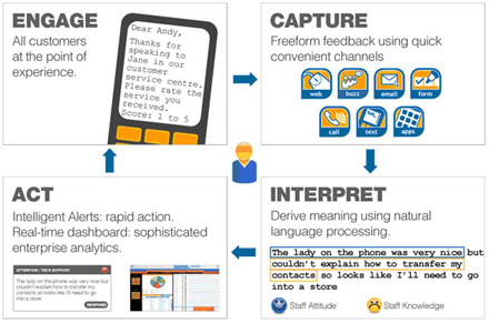 該應用軟件能夠捕捉所有聯(lián)絡渠道上任何形式的客戶反饋;包括文本,郵件,電話,網(wǎng)絡或者手寫的。然后系統(tǒng)利用先進的模式識別規(guī)則對客戶反饋進行破譯并采取適當?shù)男袆;直接響應客戶,將信息轉(zhuǎn)發(fā)給其他更適合響應的人并創(chuàng)建實時管理信息。
