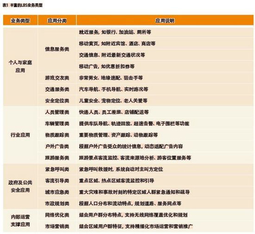 傳統(tǒng)LBS應(yīng)用主要是緊急呼叫、車輛導(dǎo)航、物流管理、人員定位等,其實LBS作為一種基本能力,可以擴(kuò)展到各類業(yè)務(wù)應(yīng)用中。根據(jù)面向的服務(wù)對象的不同,LBS業(yè)務(wù)可以分為個人與家庭應(yīng)用、行業(yè)應(yīng)用、政府與公共安全應(yīng)用和運營商內(nèi)部運營支撐應(yīng)用四大類型。每種LBS業(yè)務(wù)類型都包括各類豐富應(yīng)用(如表1),這里僅列舉部分應(yīng)用進(jìn)行簡要探討。