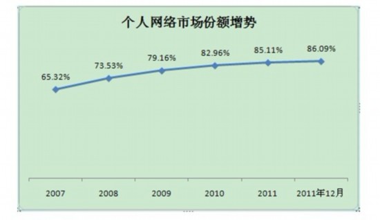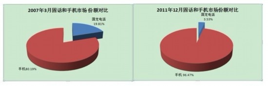手機(jī)的增長(zhǎng)非常顯著,從2007年開(kāi)始,手機(jī)用戶每年以42.7%的速度增長(zhǎng)。手機(jī)的市場(chǎng)份額從2007年的80.19%增加到2011年12月的96.47%,現(xiàn)在已經(jīng)遠(yuǎn)遠(yuǎn)超過(guò)了固話。