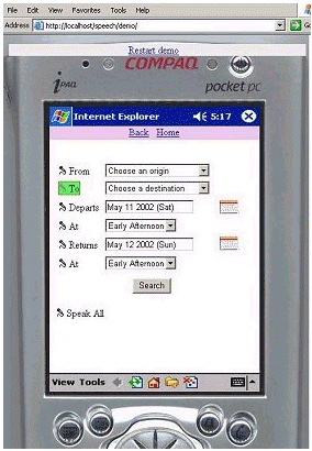 .NET Speech SDK目前為免費(fèi)提供。其中包括設(shè)置Web應(yīng)用的語音輸入/輸出動作的工具、用于根據(jù)不同的應(yīng)用來限制終端用戶語言的語音語法編輯器、語音即時編輯器、語音調(diào)試工具以及嵌入到WWW瀏覽器(面向個人電腦的IE)中的試驗(yàn)用插件等。微軟今后還將繼續(xù)強(qiáng)化其功能,在2003年公布正式版以前,準(zhǔn)備追加使用電話的語音識別功能、支持用于PDA的“Pocket Internet Explorer”的語音識別插件,以及在終端和服務(wù)器上負(fù)責(zé)語音處理的分散型語音識別功能等。上圖顯示了具有語音識別功能的面向Pocket PC的應(yīng)用的演示畫面。單擊左測的麥克風(fēng)形狀的圖標(biāo)后,就可以利用語音操作菜單。另外,.NET Speech SDK 1.0版只有英文版,供貨時間尚未確定的2.0版據(jù)稱將支持日語和其他語言。