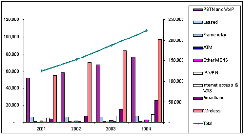 IDC亞太地區(qū)通信研究機(jī)構(gòu)的負(fù)責(zé)人Sandra Ng表示,在傳統(tǒng)數(shù)據(jù)業(yè)務(wù)市場包括租用電路、幀中繼、DDN、ATM、X.25以及ISDN,其中租用電路業(yè)務(wù)的收入依然占據(jù)了主導(dǎo)地位,隨后是DDN業(yè)務(wù)和幀中繼。2002年這一傳統(tǒng)數(shù)據(jù)業(yè)務(wù)市場的規(guī)模有望達(dá)到100億美元,增長百分之5。