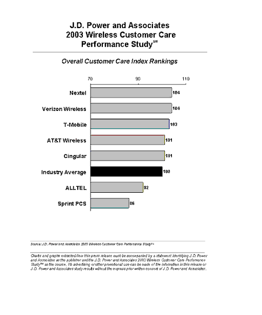 Nextel和Verizon移動(dòng)在全部七家大型移動(dòng)服務(wù)提供商的客戶服務(wù)表現(xiàn)中并列前茅。Nextel在自動(dòng)應(yīng)答系統(tǒng)方面的表現(xiàn)特別好,尤其是指引/提示部分。Verizon移動(dòng)則是在所有各個(gè)方面都表現(xiàn)超過平均值,特別是讓客服代表理解客戶的問題和比較短的打入客服中心后的電話等待時(shí)間方面。