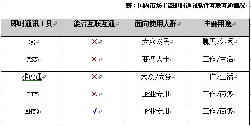 他認為,企業(yè)使用即使通訊的溝通是價值的溝通,企業(yè)內外部的溝通過程中,不能互聯互通的溝通障礙將在很大程度上影響企業(yè)內外部的信息交流甚至業(yè)務往來。他提醒筆者關注一款叫做ANYQ的系統(tǒng),他說,這是他研究以來發(fā)現最有潛力的一款已經具備互聯互通配置的企業(yè)即時通訊軟件。