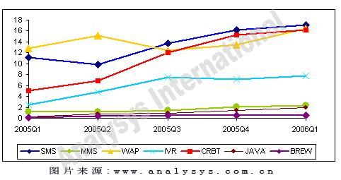 短信業(yè)務(wù)的市場規(guī)模為17.08億,比上個季度小幅增長5.4%。雖然 WAP 業(yè)務(wù)和 CRBT 業(yè)務(wù)的市場規(guī)模和短信業(yè)務(wù)非常接近,但是短信業(yè)務(wù)仍然是移動增值業(yè)務(wù)中比重最大的一塊。更為重要的是,短信業(yè)務(wù)仍然是